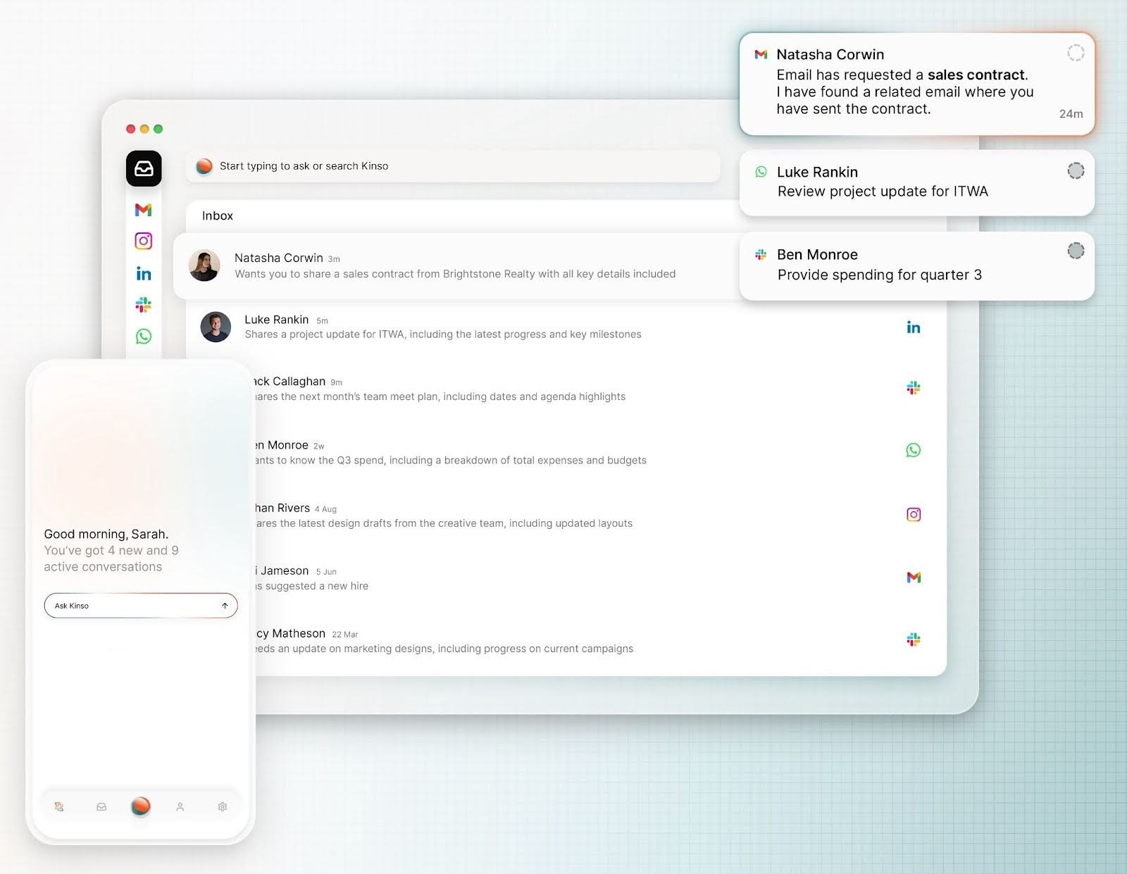 Universal search is an obvious entry point. Kinso lets users retrieve information in plain English—“Show me what Sarah said about Series A last month” is treated as a reasonable query, not a vague wish. Because the underlying graph links messages across email, Slack, WhatsApp, LinkedIn, Instagram, and more, the answer can pull from multiple channels and present a cohesive summary rather than a scatter of results.